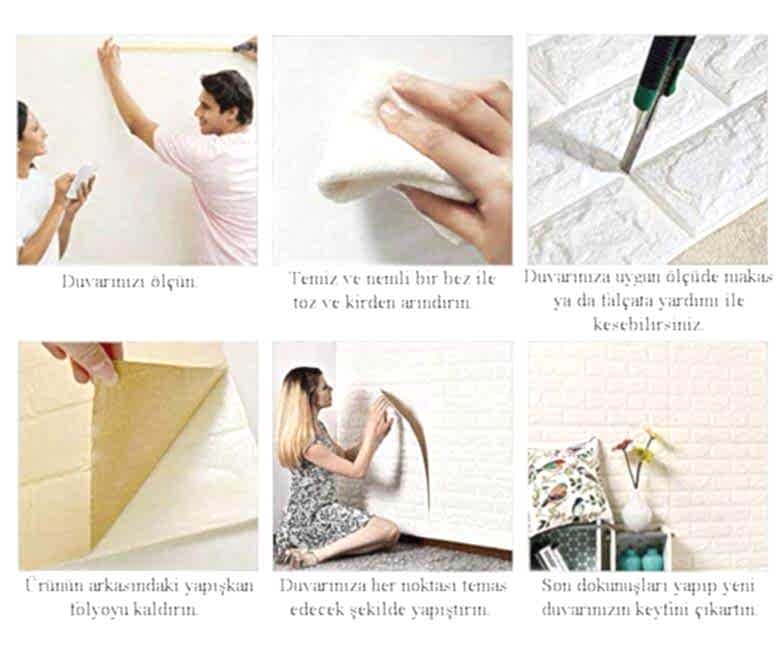 - Panellerin arkasında bütünüyle sticker vardır. Sadece koruyucu katmanı söküp duvara yapıştırmanız gerekmektedir.